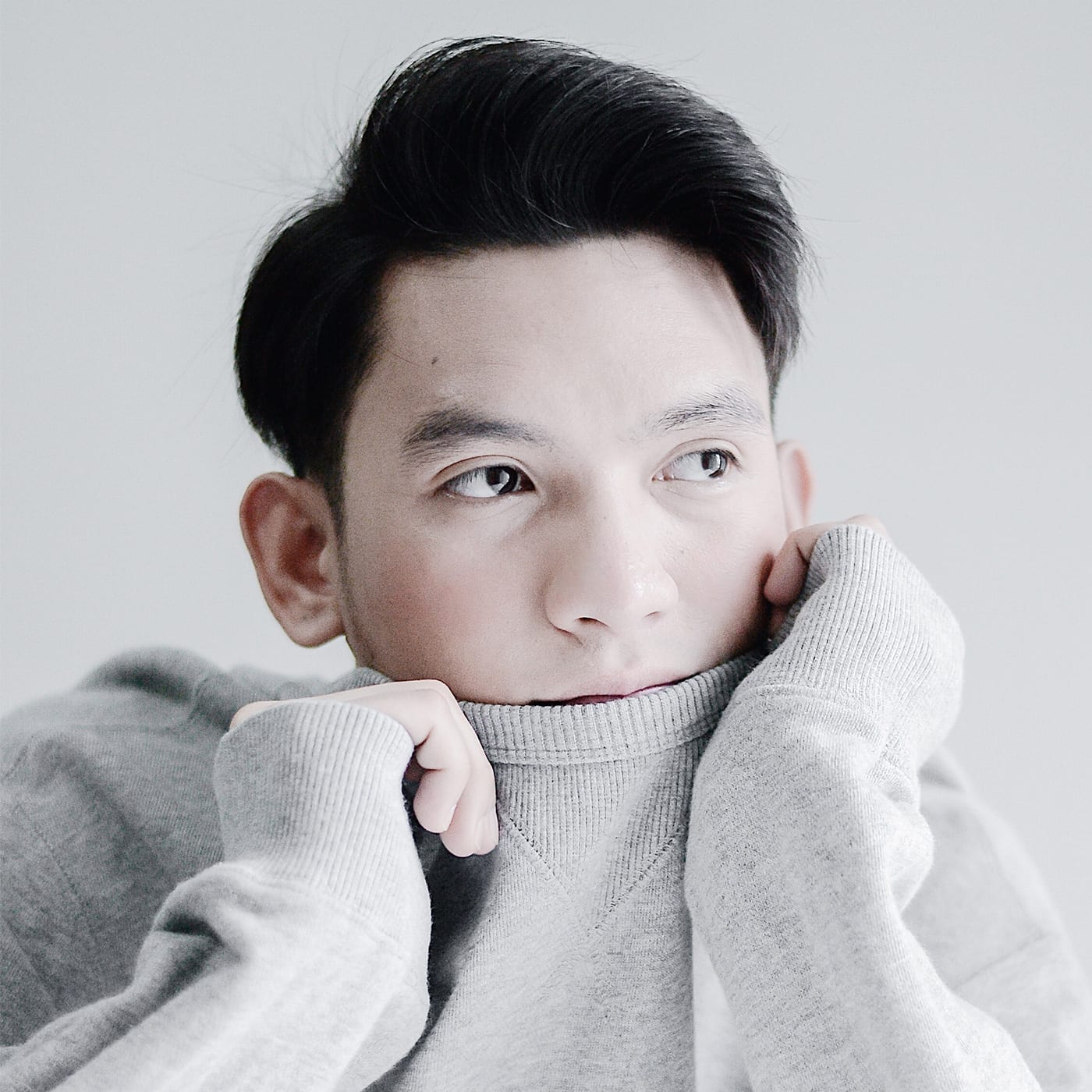 Man wearing gray long-sleeved top